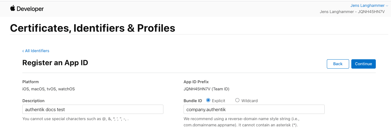 authentik). - For your Bundle ID, use the reverse of your authentik domain, for example: